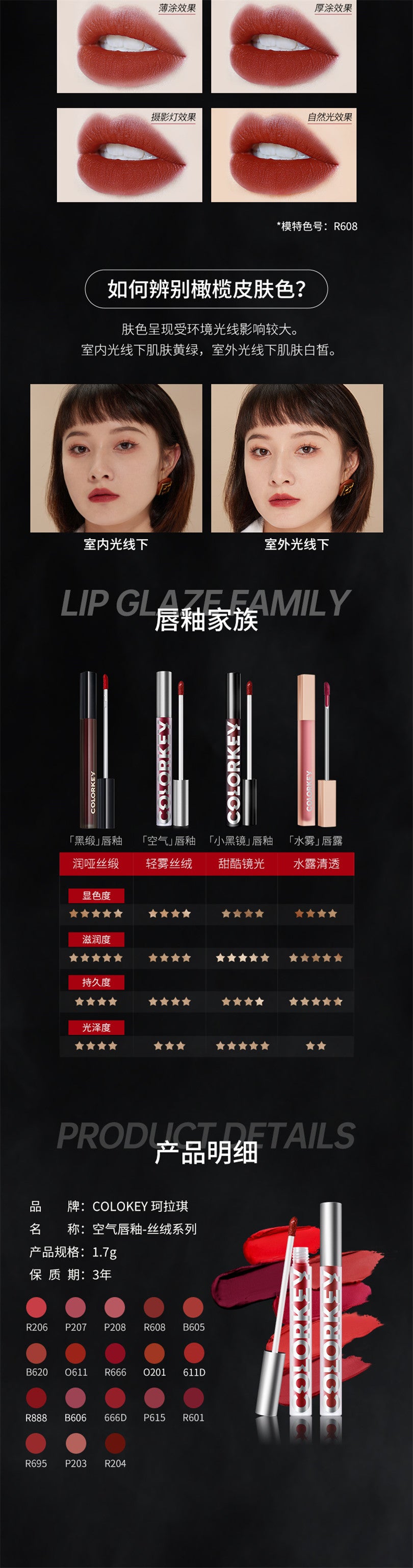 【自营】中国COLOR KEY珂拉琪 空气唇釉 丝绒系列 R666 珂拉琪红 1.7g 轻雾丝绒柔雾哑光唇彩唇蜜