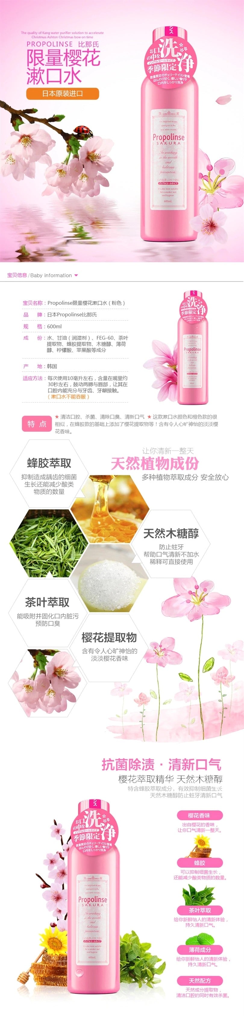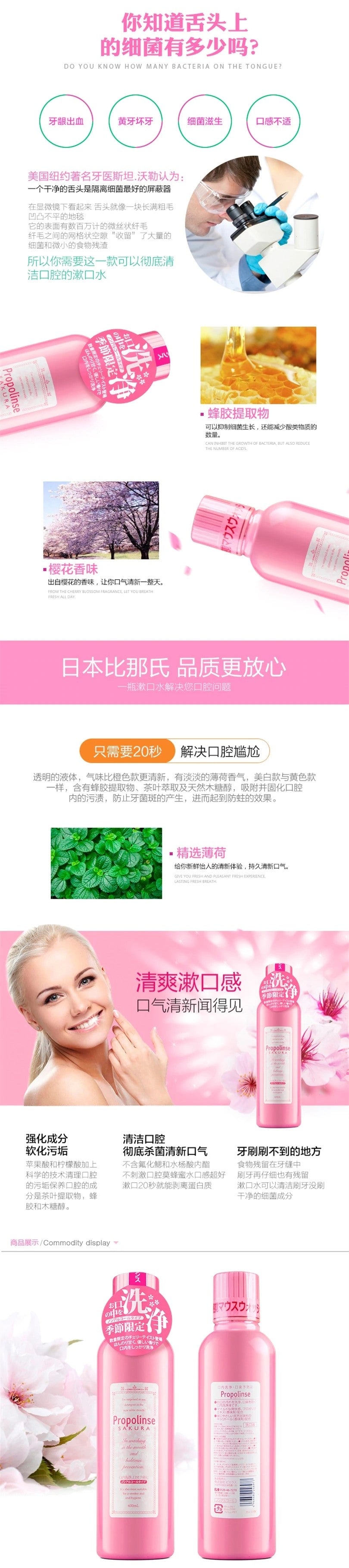 【自营】日本PROPOLINSE比那氏 蜂胶美白复合漱口水 樱花味 600ml
