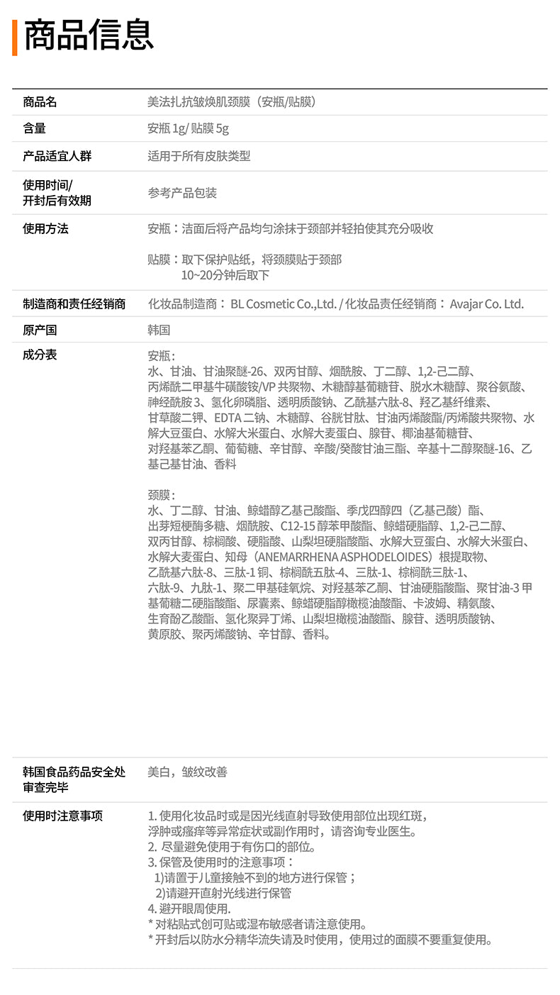 【自营】韩国AVAJAR美法扎 颈膜 5片/盒 淡化颈纹贴紧致提拉护理颈部补水滋润颈精华