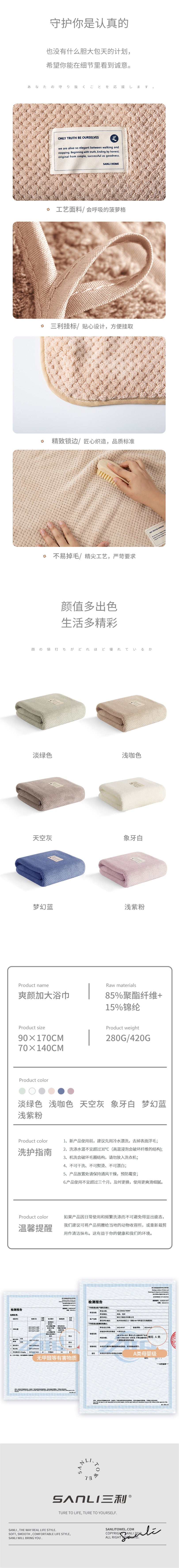 【自营】中国SANLI三利 菠萝格浴巾 90*170 浅咖色 1条装 吸水速干大尺寸全身包裹