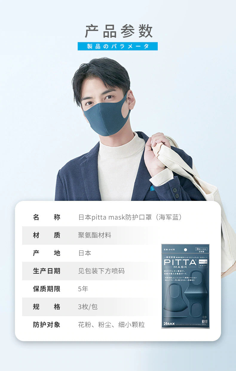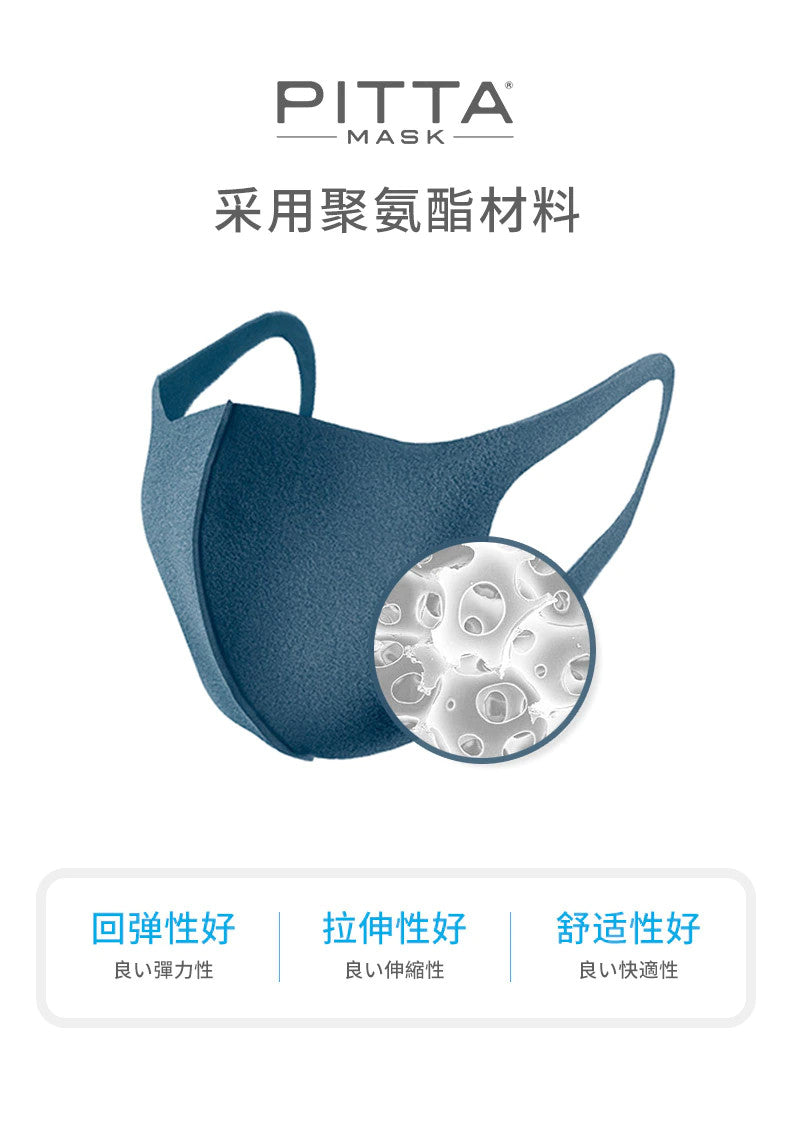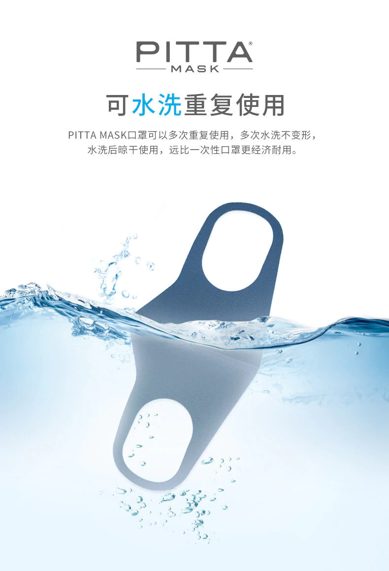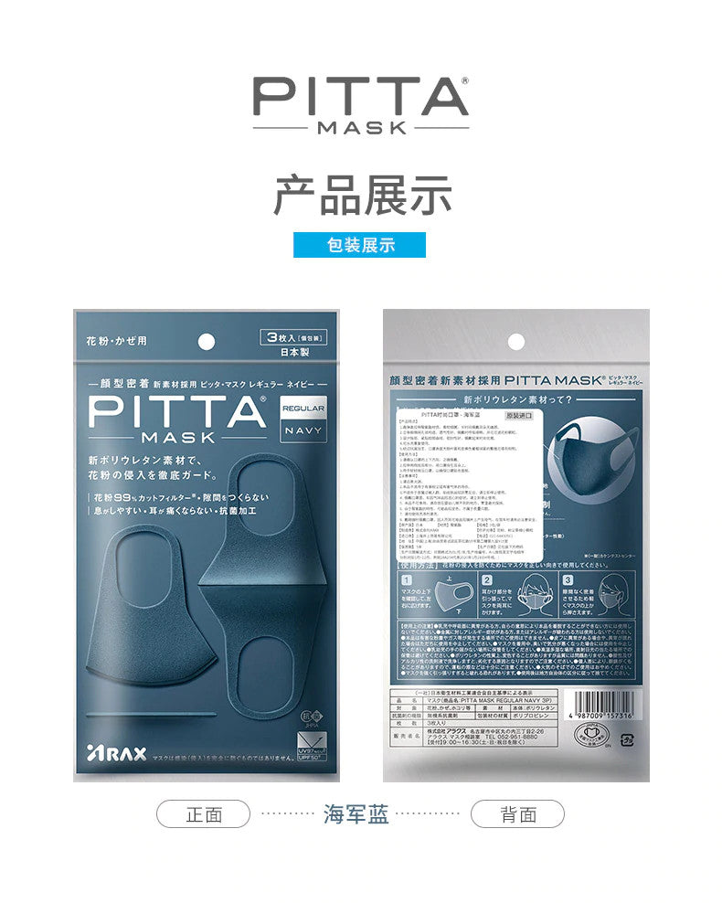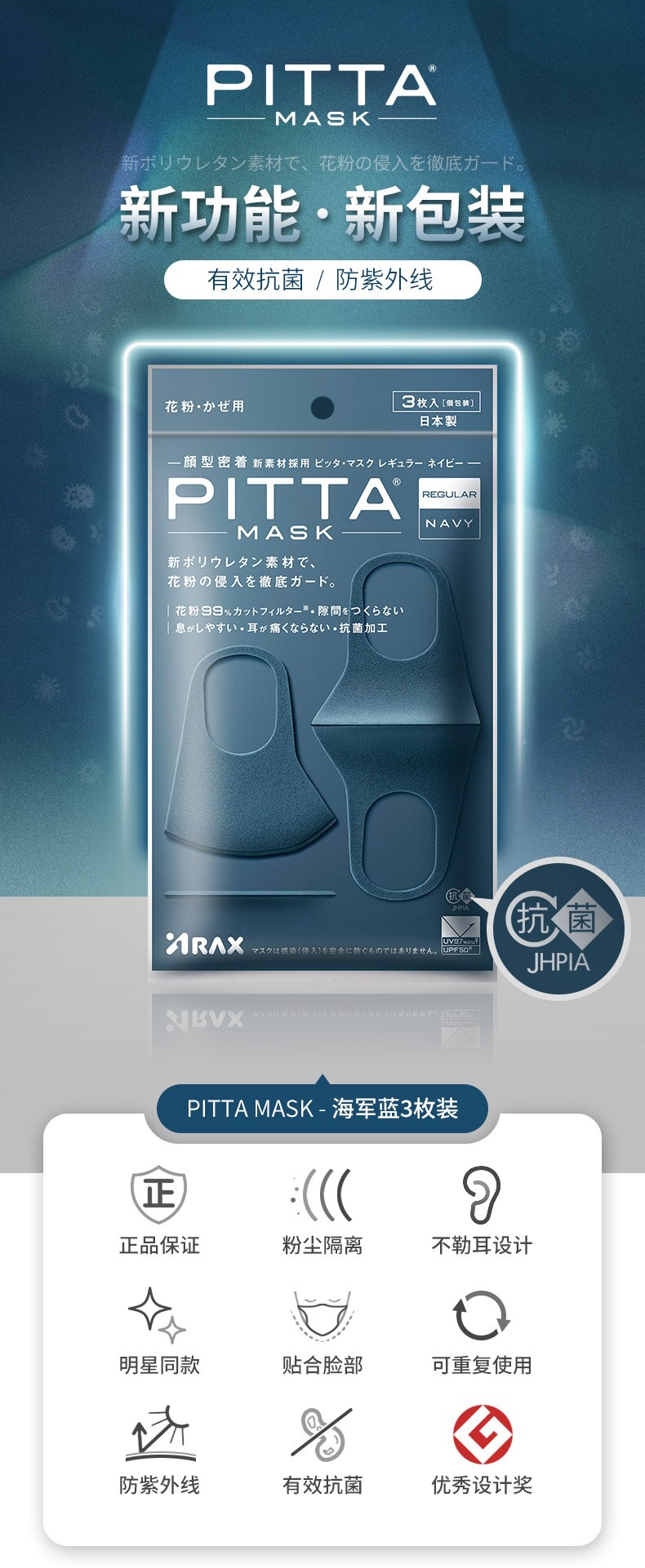 【自营】日本PITTA MASK 新版立体可水洗防尘防花粉透气口罩 #海军蓝 3枚入 明星同款