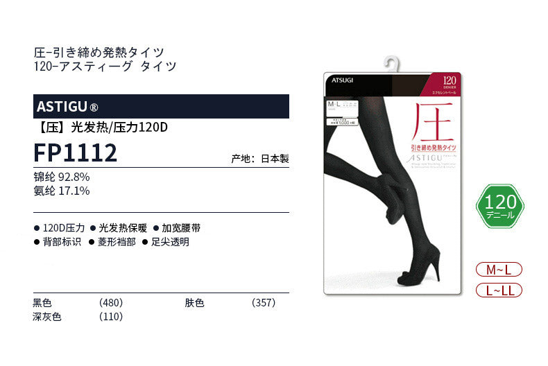 【自营】日本厚木ATSUGI 120D微压力瘦腿丝袜 黑色(480) 发热连裤袜 L~LL 臀围90-103 身高155cm-170cm 13-20摄氏度左右(初秋,初冬)