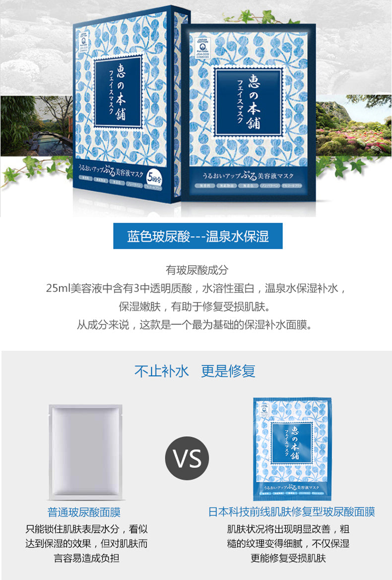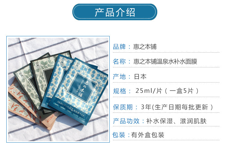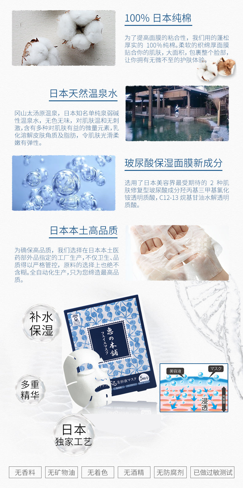 【自营】日本惠之本铺 温泉系美人汤纯净无添加温泉水保湿面膜 #蓝色玻尿酸 5片入