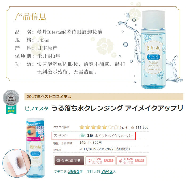 【自营】日本MANDOM曼丹 BIFESTA 温和低刺激水油分离眼唇卸妆液 145ml COSME大赏第一位