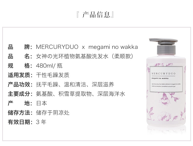 【自营】日本MEGAMI NO WAKKA 女神洗发水 MERCURYDUO 植物氨基酸深层海洋精华 柔顺款 无硅洗发水 480ml