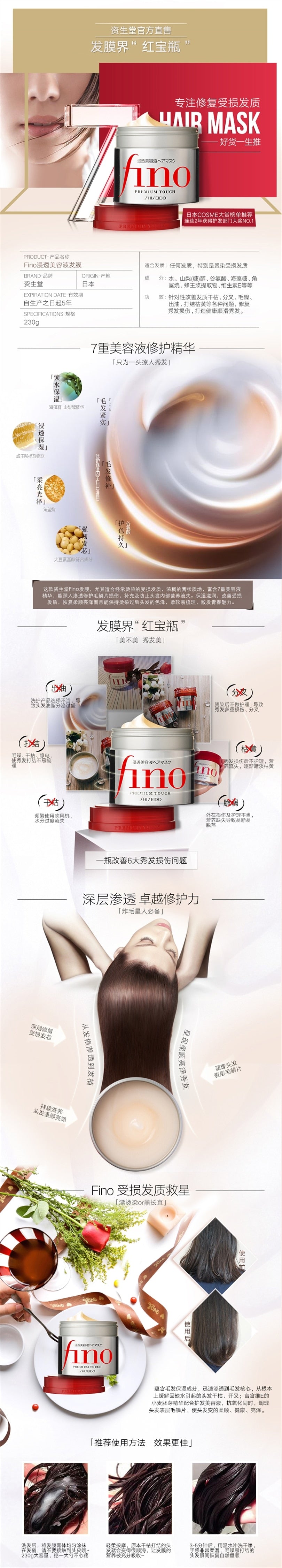 【自营】日本SHISEIDO资生堂 FINO 高效浸透修复发膜 受损发专用 230g