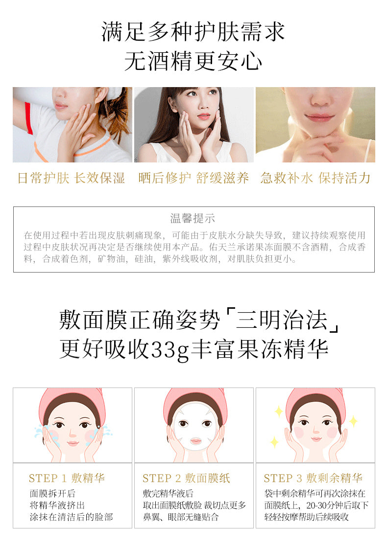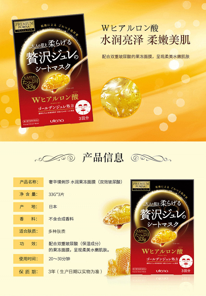 【自营】日本UTENA佑天兰 PREMIUM PURESA 双重玻尿酸深层保湿啫喱果冻面膜 3片入