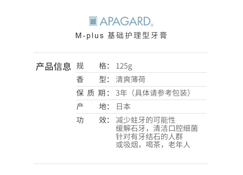 【自营】日本APAGARD M-PLUS 全效微粒子亮白款牙膏 125g 基础护理型 修护清新口气