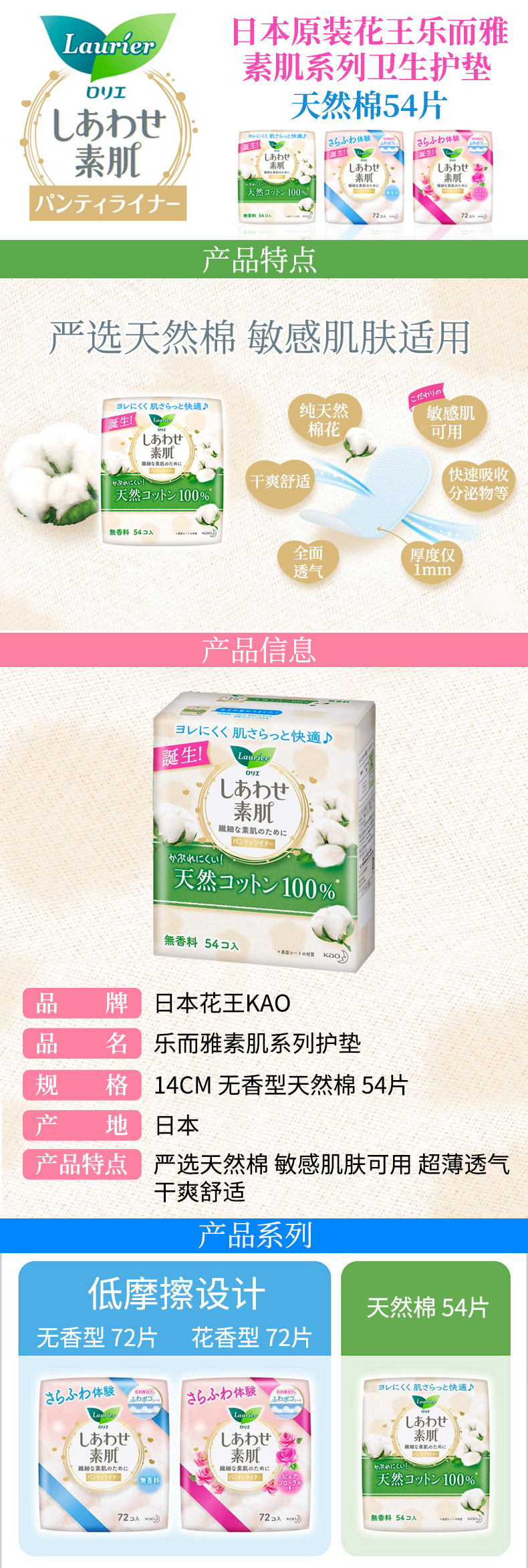 【自营】日本KAO花王 Laurier乐而雅敏感肌素肌系列天然棉护垫 54片*1包 14cm 无香型