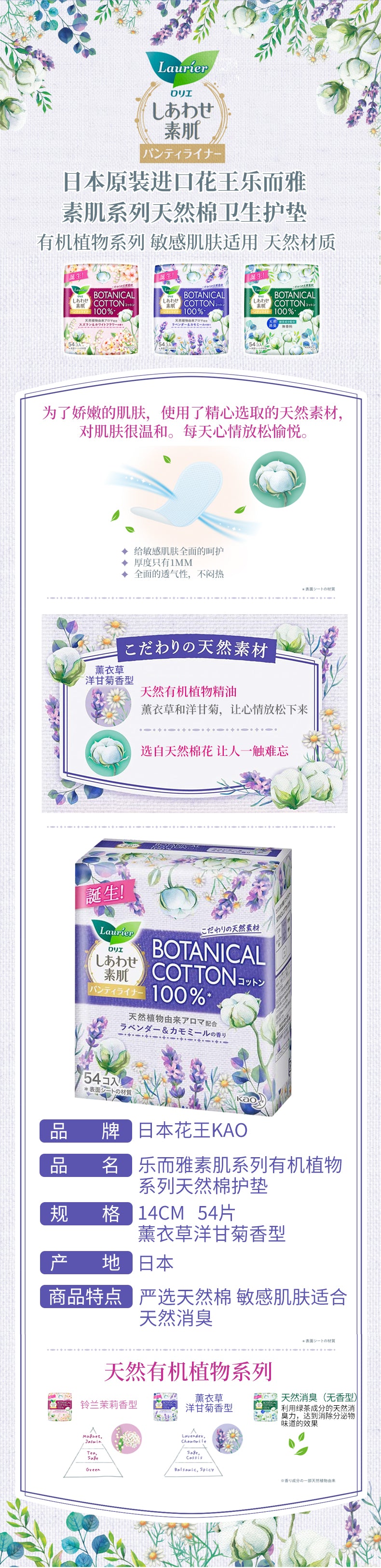 【自营】日本KAO花王 Laurier乐而雅素肌系列有机植物天然棉护垫 54片*1包 14cm 薰衣草洋甘菊香型