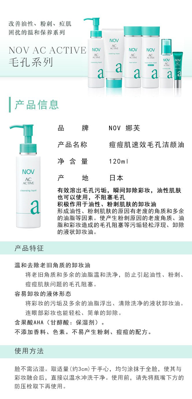 【自营】日本NOV娜芙 痘痘肌AC-ACTIVE 速效毛孔洁颜卸妆油 120ml 控油保湿低刺激