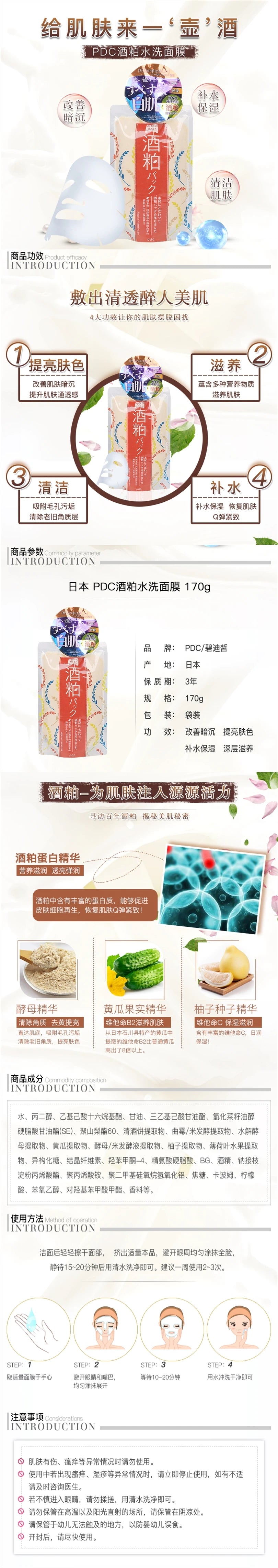 【自营】日本PDC 酒粕面膜 170g 酒糟提亮肤色去黄改善暗沉冲洗型 范冰冰推荐