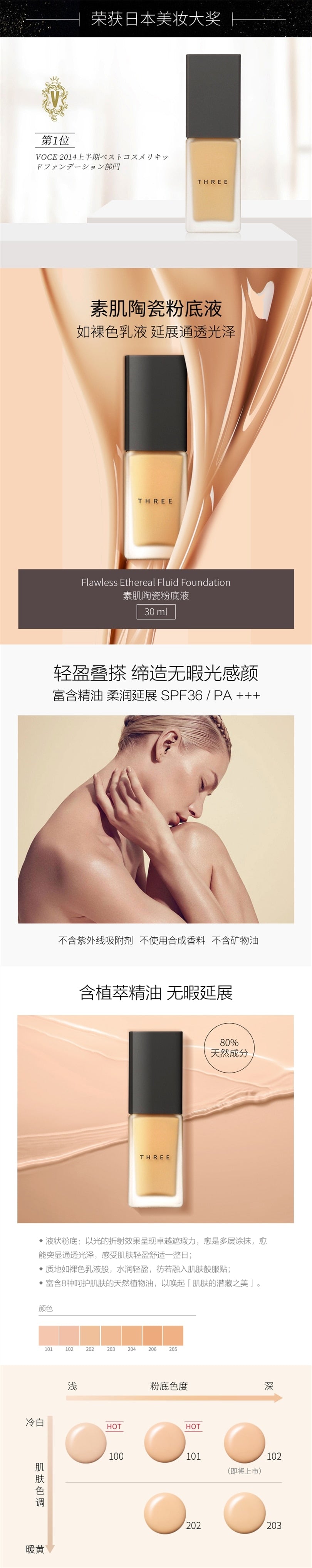 【自营】日本THREE 凝光水粉霜 UV防护精油粉底液 #101 SPF36 PA+++ 30ml