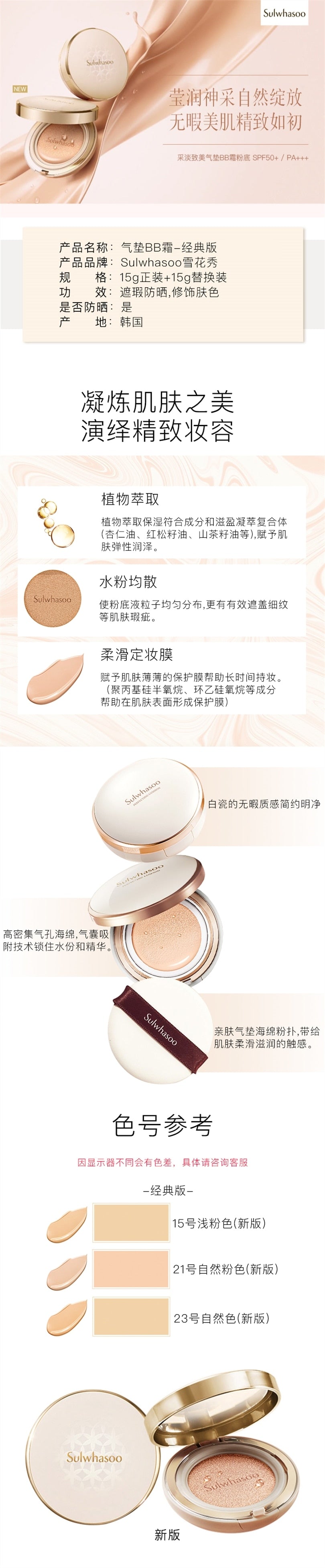 【自营】韩国SULWHASOO雪花秀 采淡致美气垫BB霜粉底(内附替换芯) EX #15浅粉色 SPF50+ PA+++ 15g*2