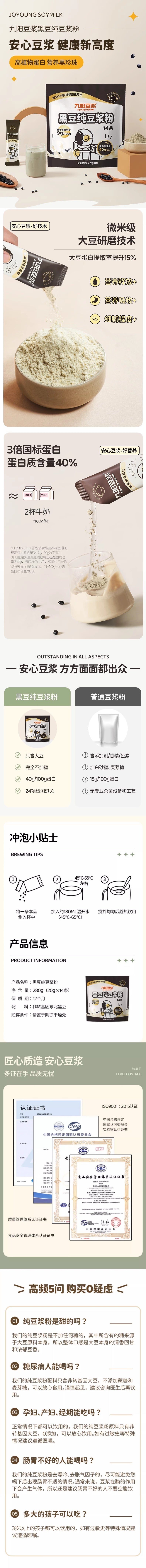 【自营】中国九阳 黑豆纯豆浆粉 自立袋 20g*7条 豆浆粉豆粉营养早餐速溶豆浆