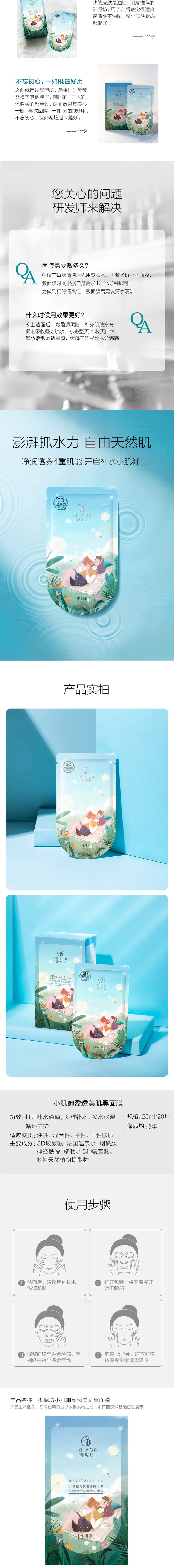 【自营】中国UNIFON御泥坊 小肌御盈透美肌黑面膜 20片入 补水保湿滋润玻尿酸清洁竹炭贴片面膜