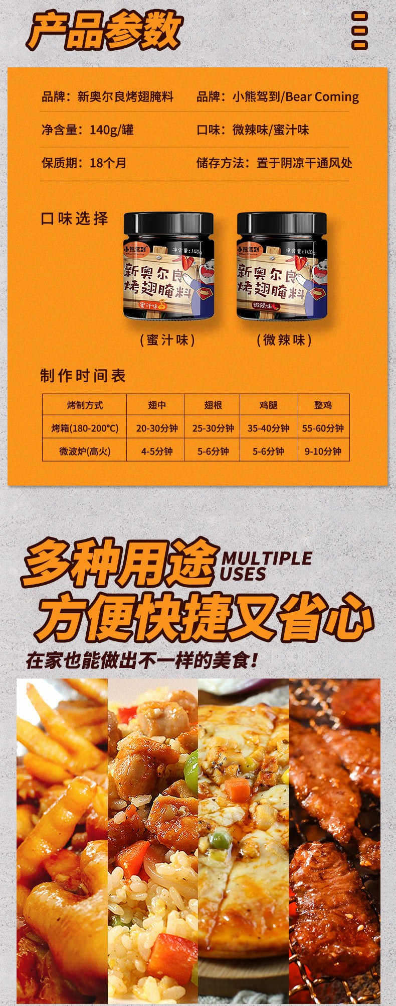【自营】中国BEAR COMING小熊驾到 新奥尔良烤翅腌料 140g 家用烤鸡翅粉 蜜汁味