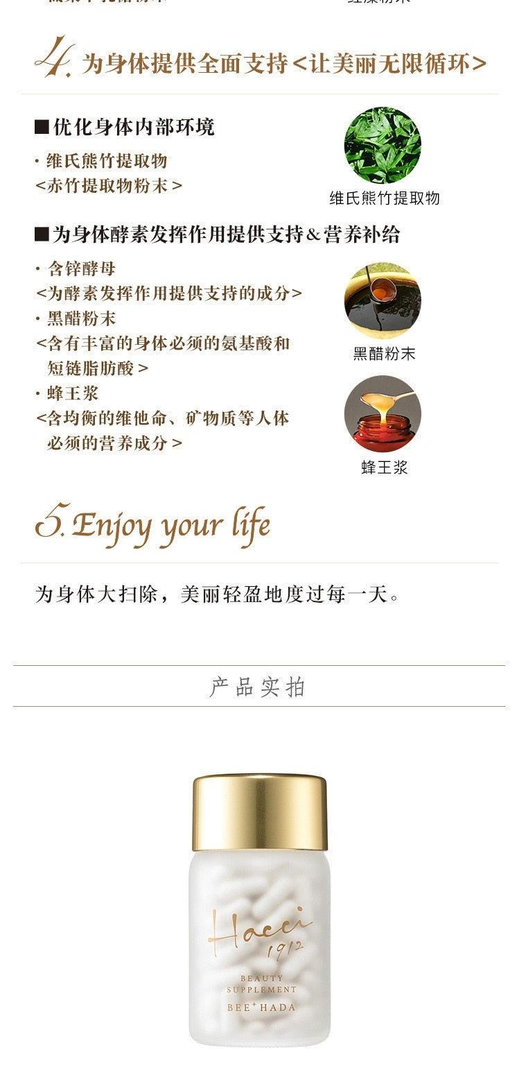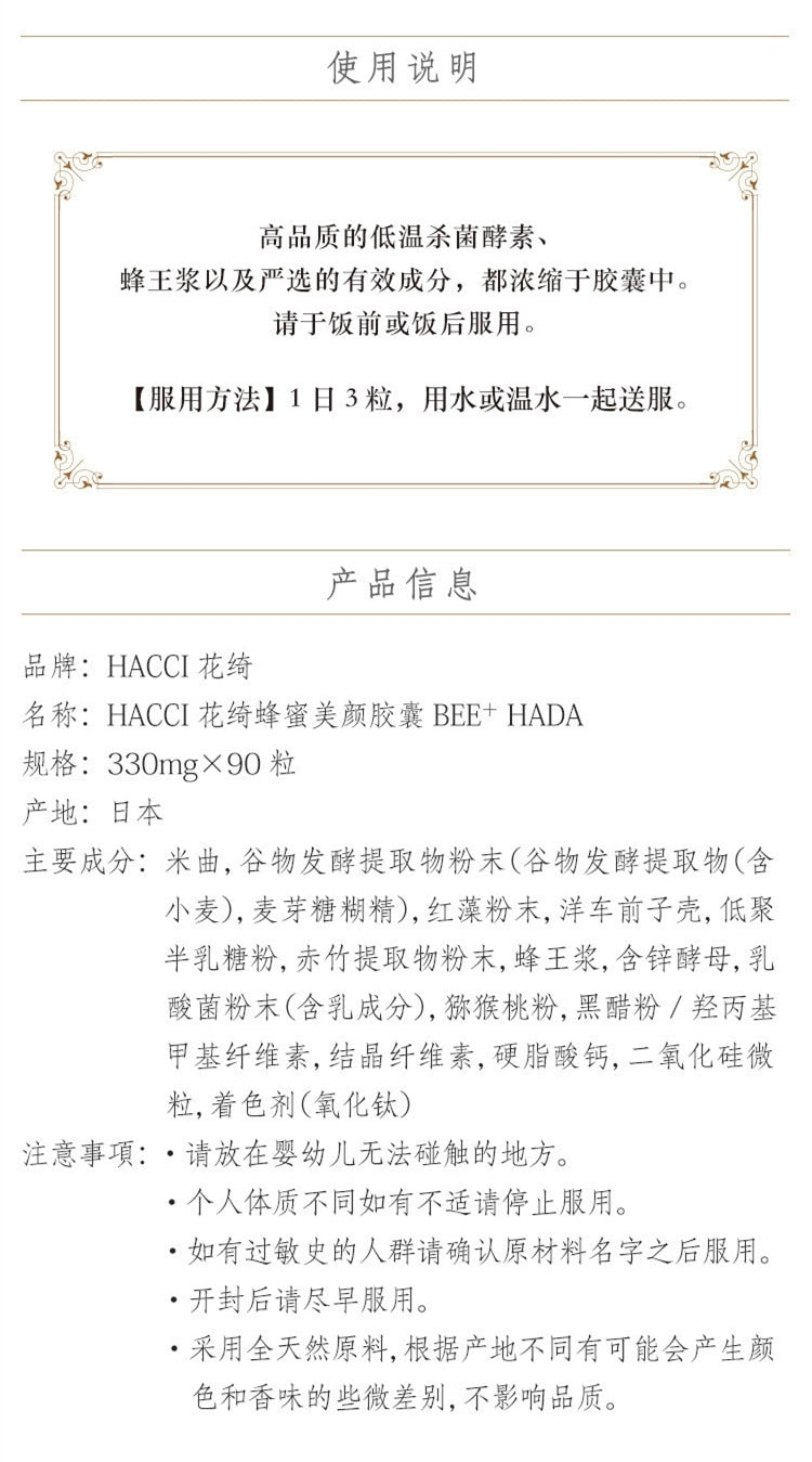 【自营】日本HACCI花绮 蜂蜜美颜胶囊BEE+HADA 330㎎×90粒