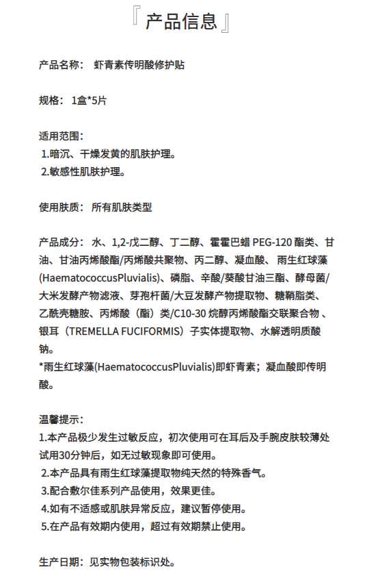 【自营】敷尔佳VOOLGA 灯泡膜 虾青素传明酸修护贴面膜 5枚/盒 层层抑黑 远离暗沉